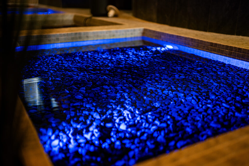 Spróbuj leczniczego spaceru w wodzie o zmiennej temperaturze. Ścieżka składa się z czterech niecek wypełnionych wodą – naprzemiennie 16 stopni C i 40 stopni C. Barwa oświetlenia niecki odpowiada temperaturze wody.